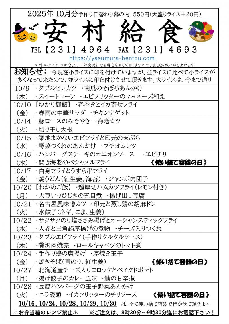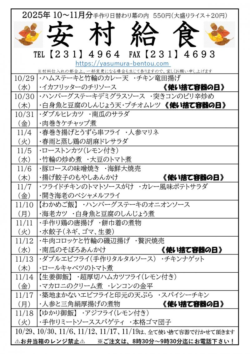 下記献立表の色が付いてる日は値引きキャンペーンとなっております。