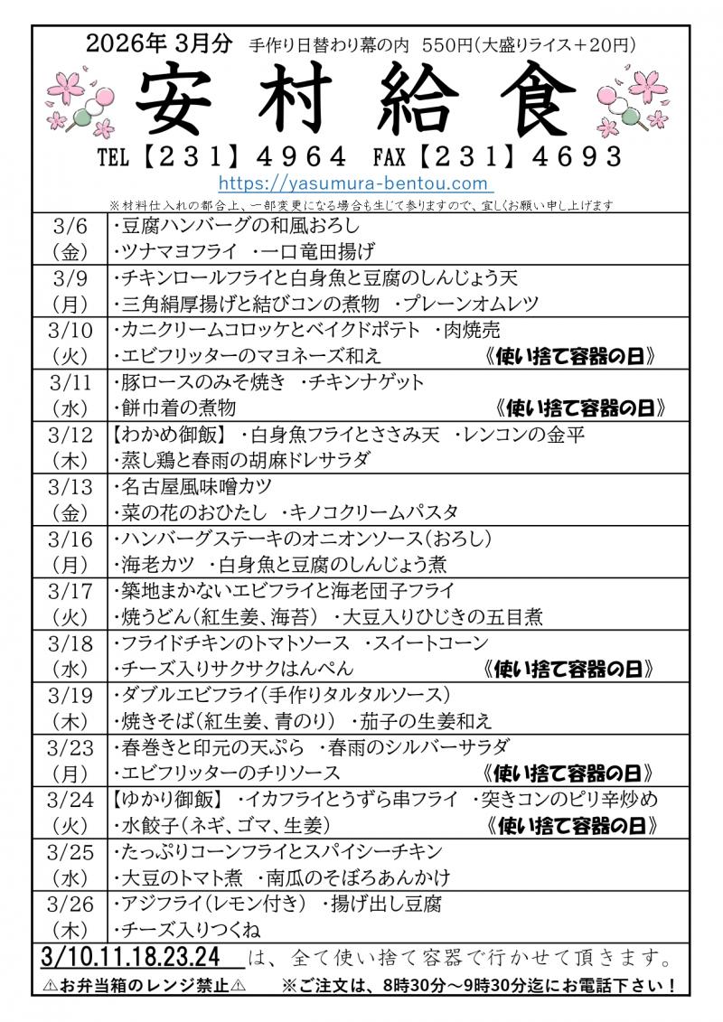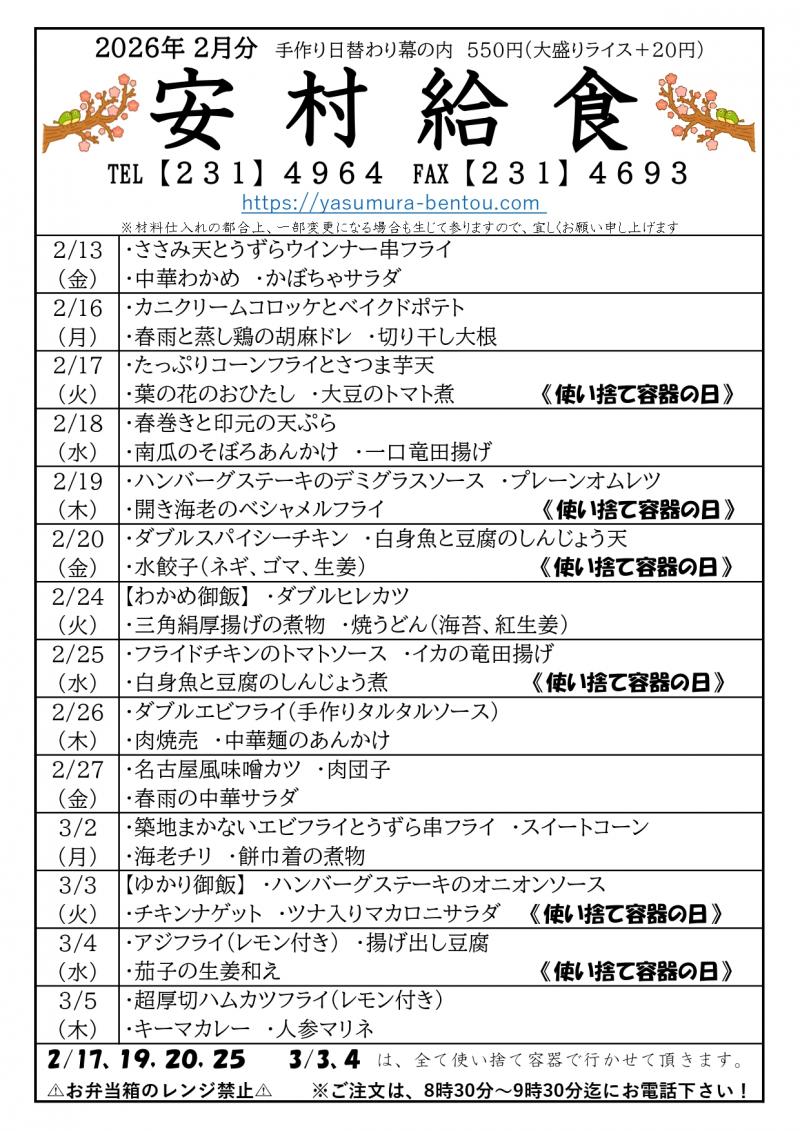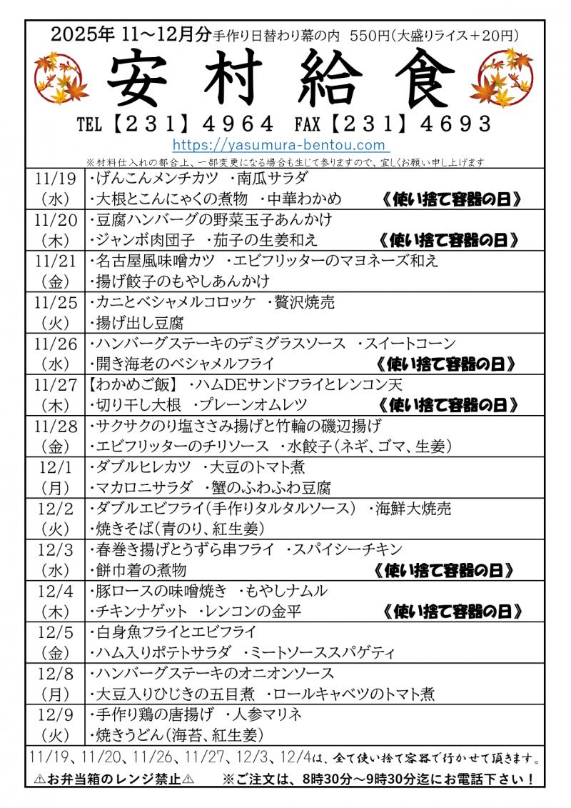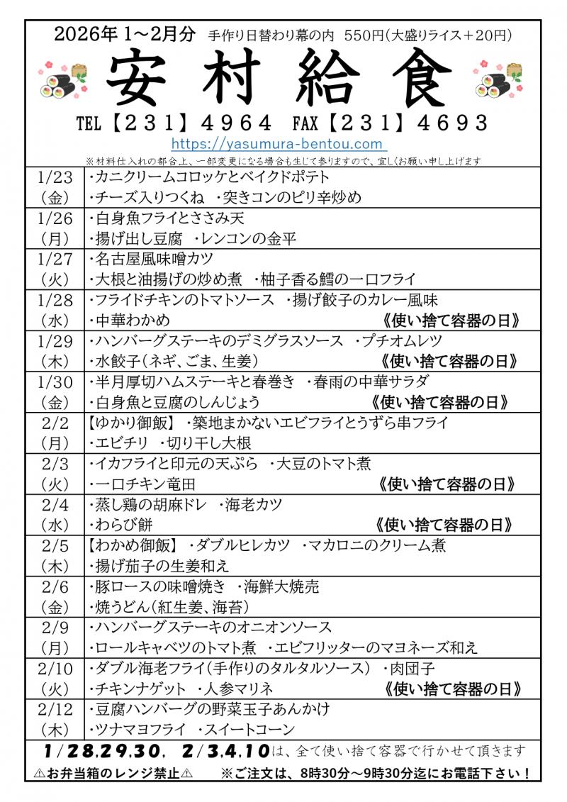 下記献立表の色が付いてる日は値引きキャンペーンとなっております。